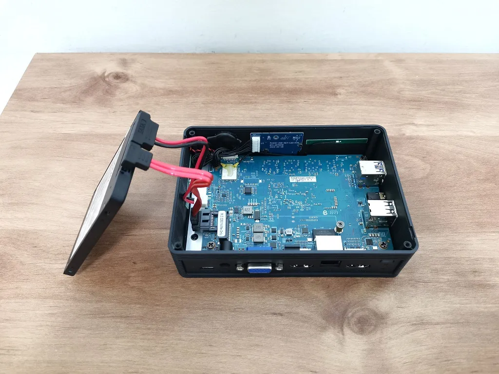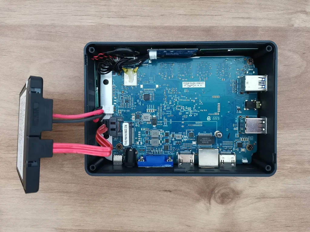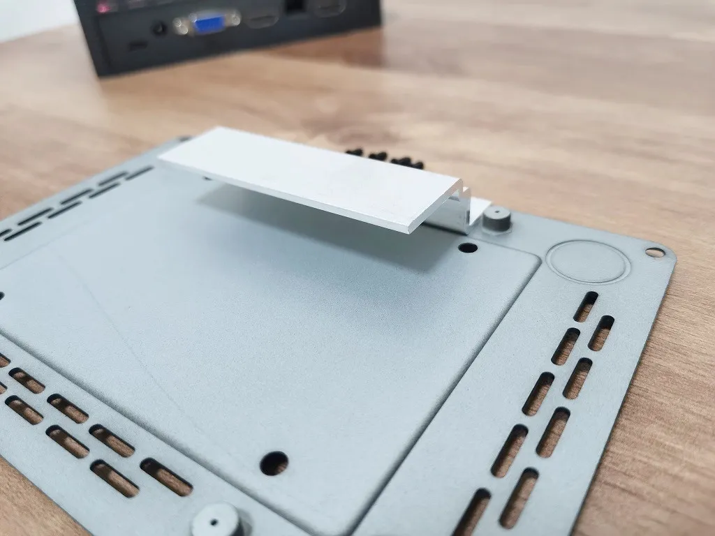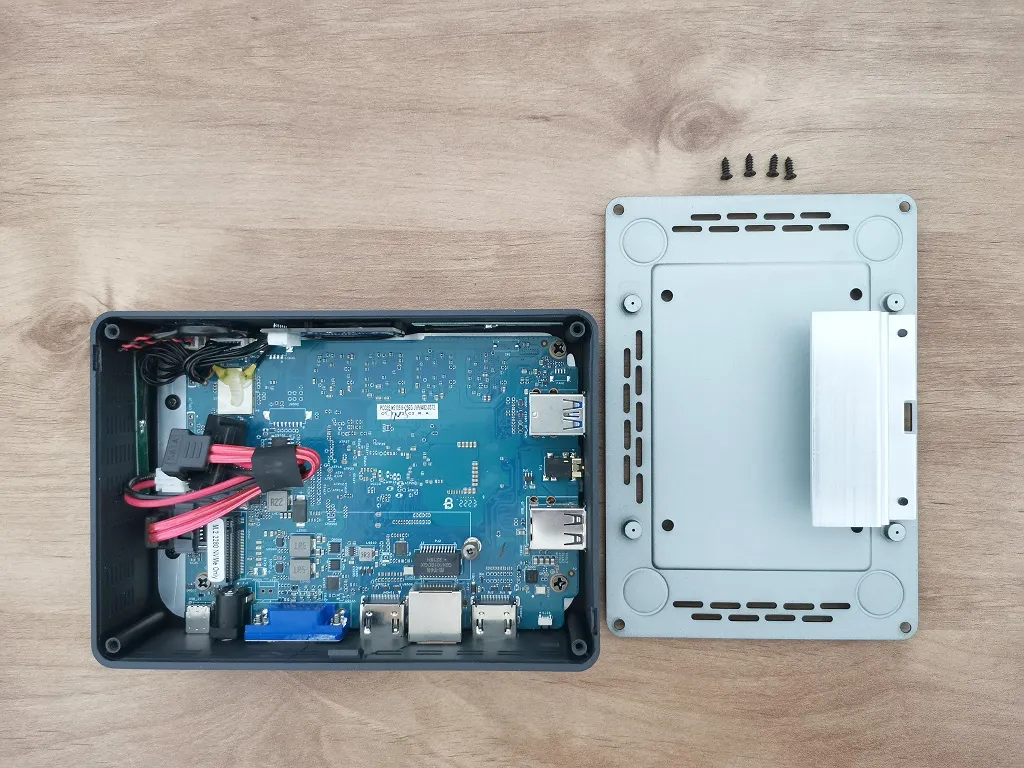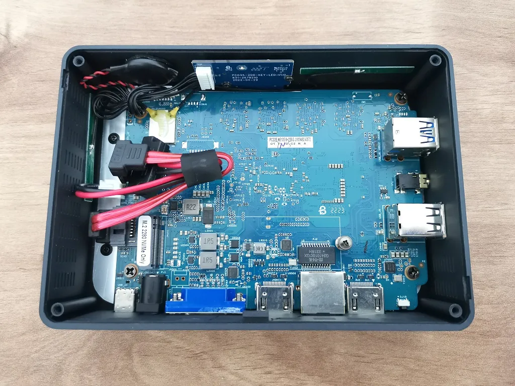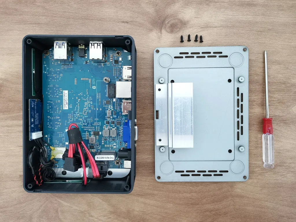 While we did not attempt to disassemble the PCB from the case, once you remove the cover, you will find a metal plate securely attached to the top side of the PCB. This ingenious placement serves to offer efficient passive cooling. As the name suggests, we proudly introduce a fanless product. With no fans, the device operates quietly, generating absolutely no noise. This allows for smooth usage during late hours, such as at night, without causing any disturbance to the surrounding environment.