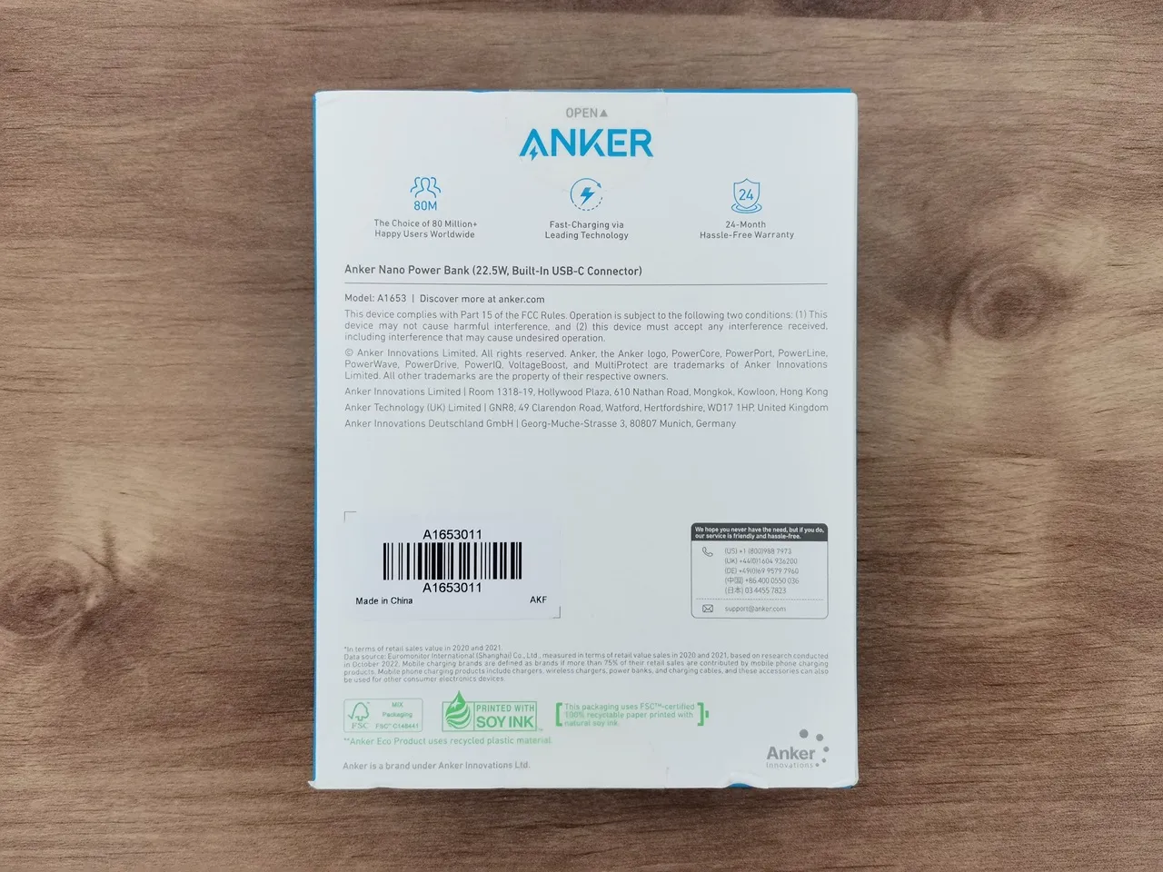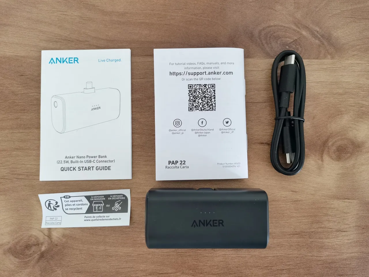 | What You Get! | Anker Nano Power Bank (22.5W, Built-In USB-C Connector), 2 ft / 0.6 m USB-C to USB-C cable, welcome guide, user manual, 24-month worry-free warranty, and our friendly customer service. |