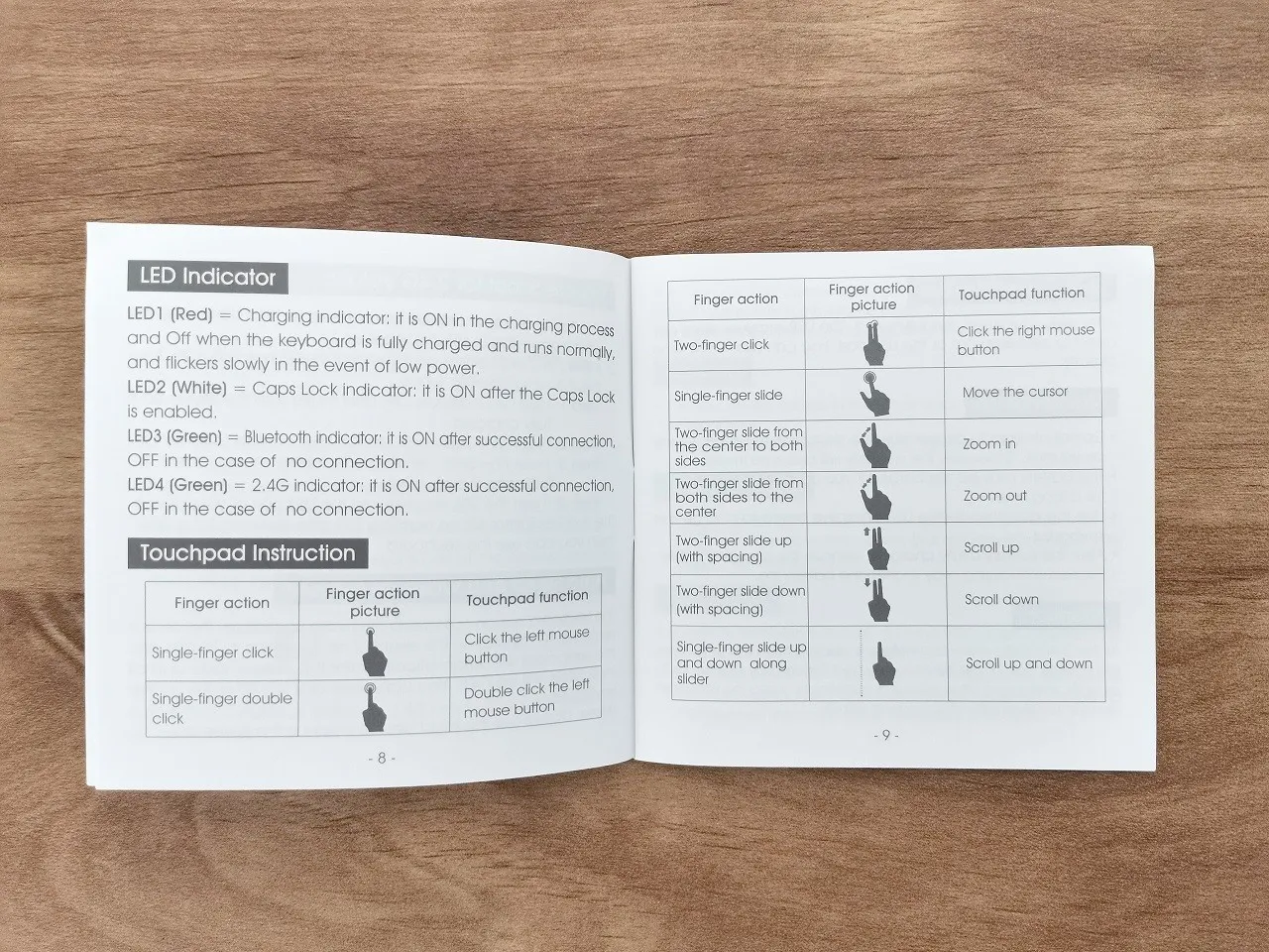 | Package Contents | 1 x K22 Wireless keyboard 1 x USB Charging Cable 1 x User Guide |