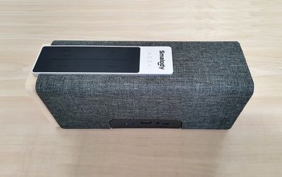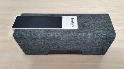 In the design arena, the external appearance is clean and impressive. You got a nice fabric covering most of the speaker body, giving it a modern and premium style. The speaker is designed to be used horizontally, but if you want to place it on a small shelf or desk it can also be positioned vertically, which is a nice option to have.