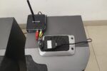 Streaming audio from a mobile phone to a pair of wired speakers.