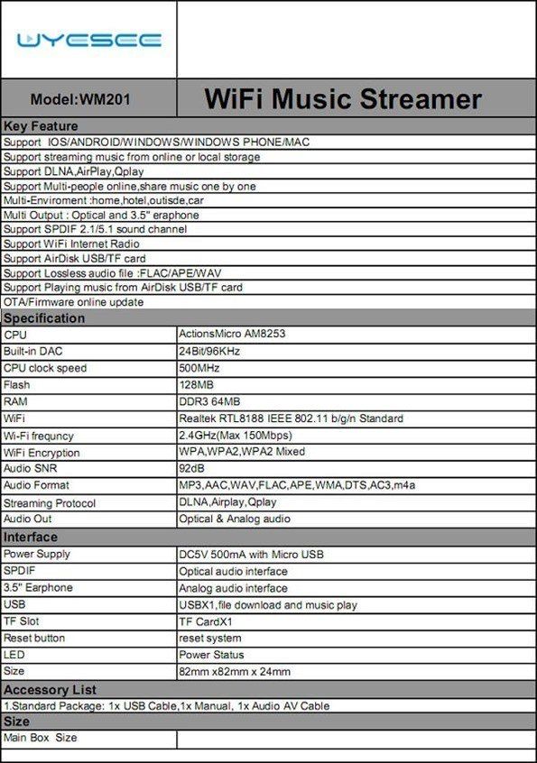 The SoundMate WM201 is a Wi-Fi audio streaming device, which is able to transform your old speakers into a modern Wi-Fi HIFI Smart audio System. With Soulmate, the user can stream music from local storage or cloud from any of your devices by airplay or DLNA streaming protocol, including phone, Tablet PCs, laptops with complete OS support for Android, iOS, Windows, Windows and Mac compatibility.