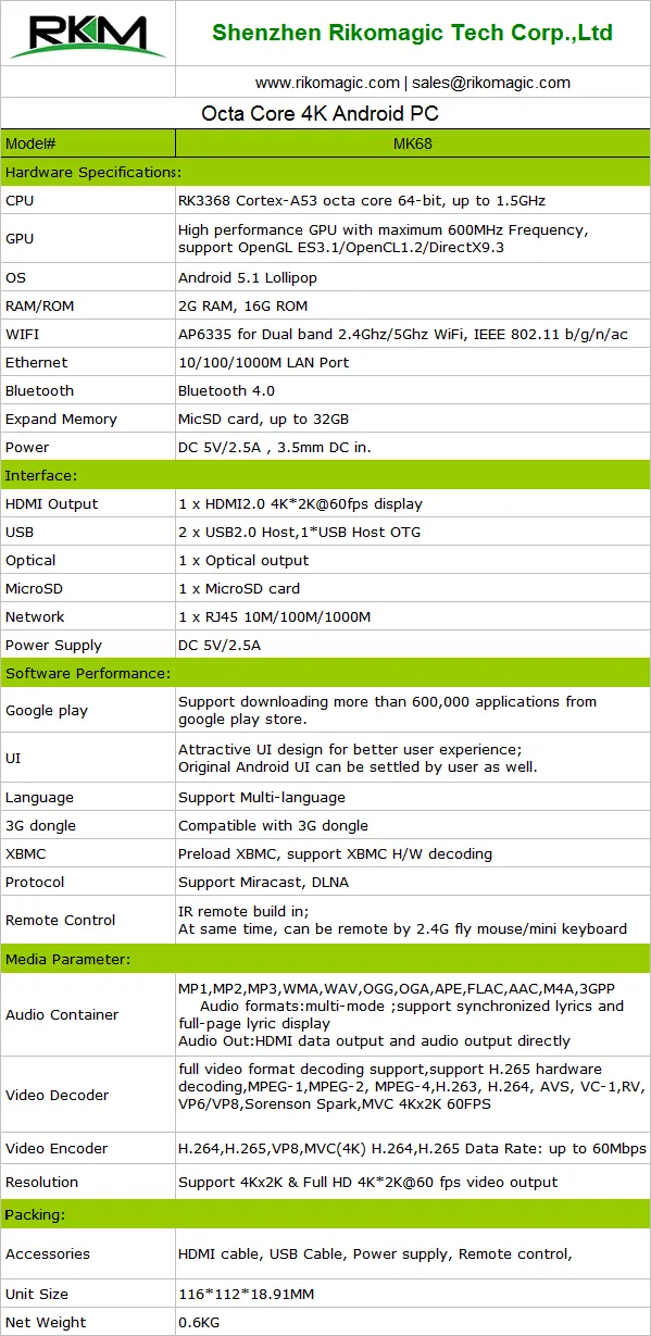 Rikomagic MK68 TV box is equipped with Rockchip latest RK3368 octa-core 1.5 GHz SoC (Cortex A53) 64-bit processor running Android Lollipop 5.1 operating system. Rikomagic is proudly introducing its first TV Box, featuring the latest version of the Android operating system. In addition, the MK68 GPU uses PowerVR G6110 GPU, which may offer less performance compared to the Mali-T764 used in previous RK3288 Soc Solution, Packed with few new interesting features which makes it a low cost-effective solution for Tablet PCs and Set-top box markets. New special features include 4K video 60 fps playback support, HDMI version 2.0 with H.265 transcoding technology developed by Rockchip independently for transcoding multichannel HD videos in real-time.