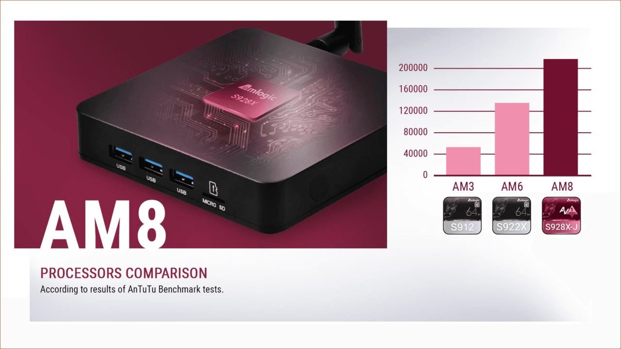 Featuring an awe-inspiring hardware configuration, the AM8 stands out with its powerful Amlogic S922X-J processor. This remarkable device takes performance to the next level with its robust Penta-Core (5 cores), including four additional Cortex-A55 cores and a single Cortex-A76 core.