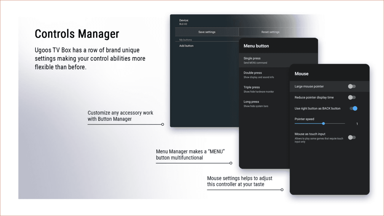 The Ugoos AM8 IR Learning Remote Control is a remote control device that allows you to control your Ugoos AM8 Android TV box. It features a built-in infrared receiver that can learn and replicate the functions of other remote controls, such as your TV or DVD player remote. In addition, you also have a voice search function. To use the voice search feature on your Android TV box, simply press the dedicated voice search button on the remote control. With this feature, you can effortlessly search for content across various apps and platforms by simply using voice commands on your remote control. This eliminates the need for typing or navigating through menus, making it quicker and more convenient to find what you’re looking for.
