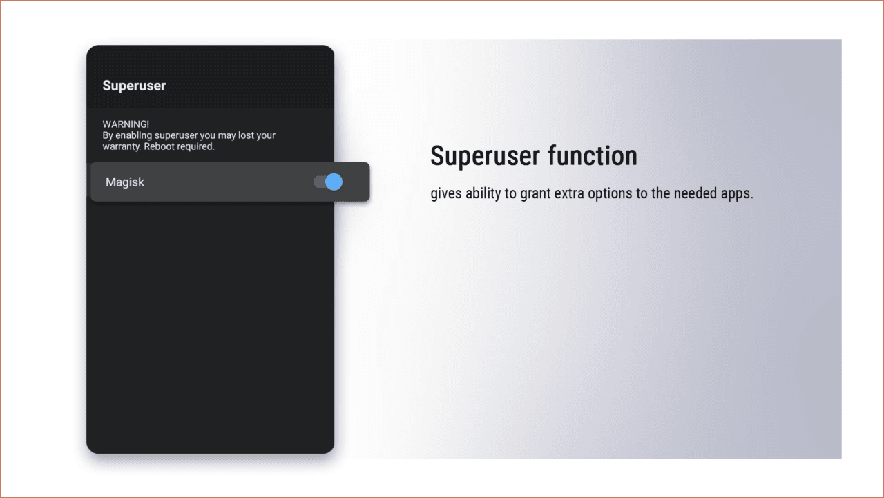 All Ugoos devices come with a pre-installed feature called “Ugoos Settings”. The “Superuser” feature is a main setting that allows the installation of silent root or SuperSu app for manual operations. Users are fully responsible for using this special root feature.