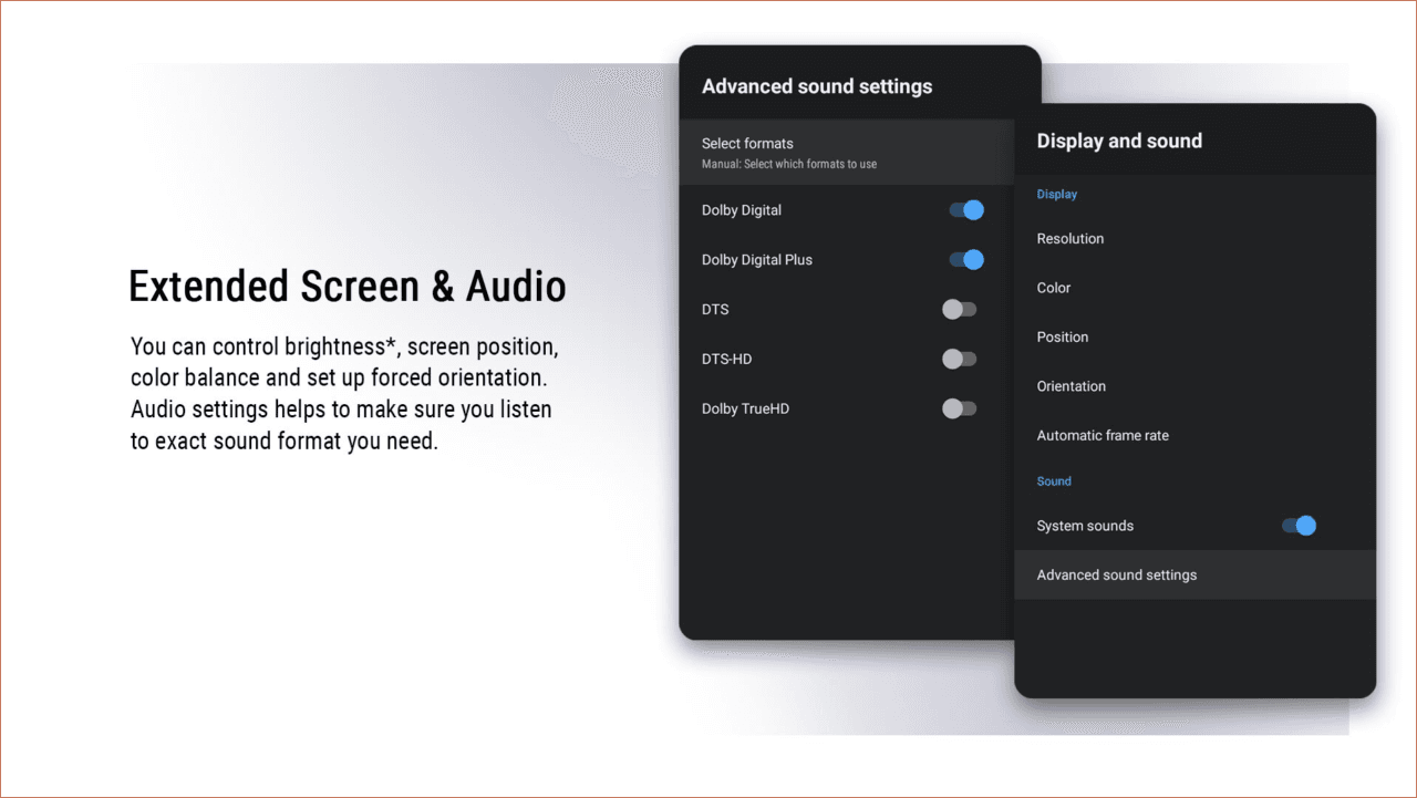 In Advanced Audio Settings, you can choose your preferred digital audio formats. You have the freedom to enable or disable them as you please. In addition, you have the option to customize various aspects such as display position, colors, resolution, and more. These settings can be found under the Display and Sound section.