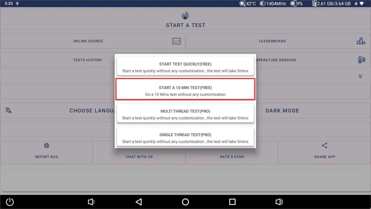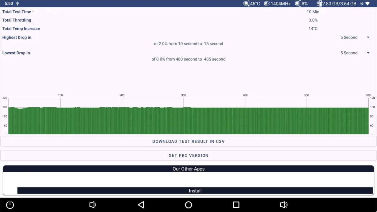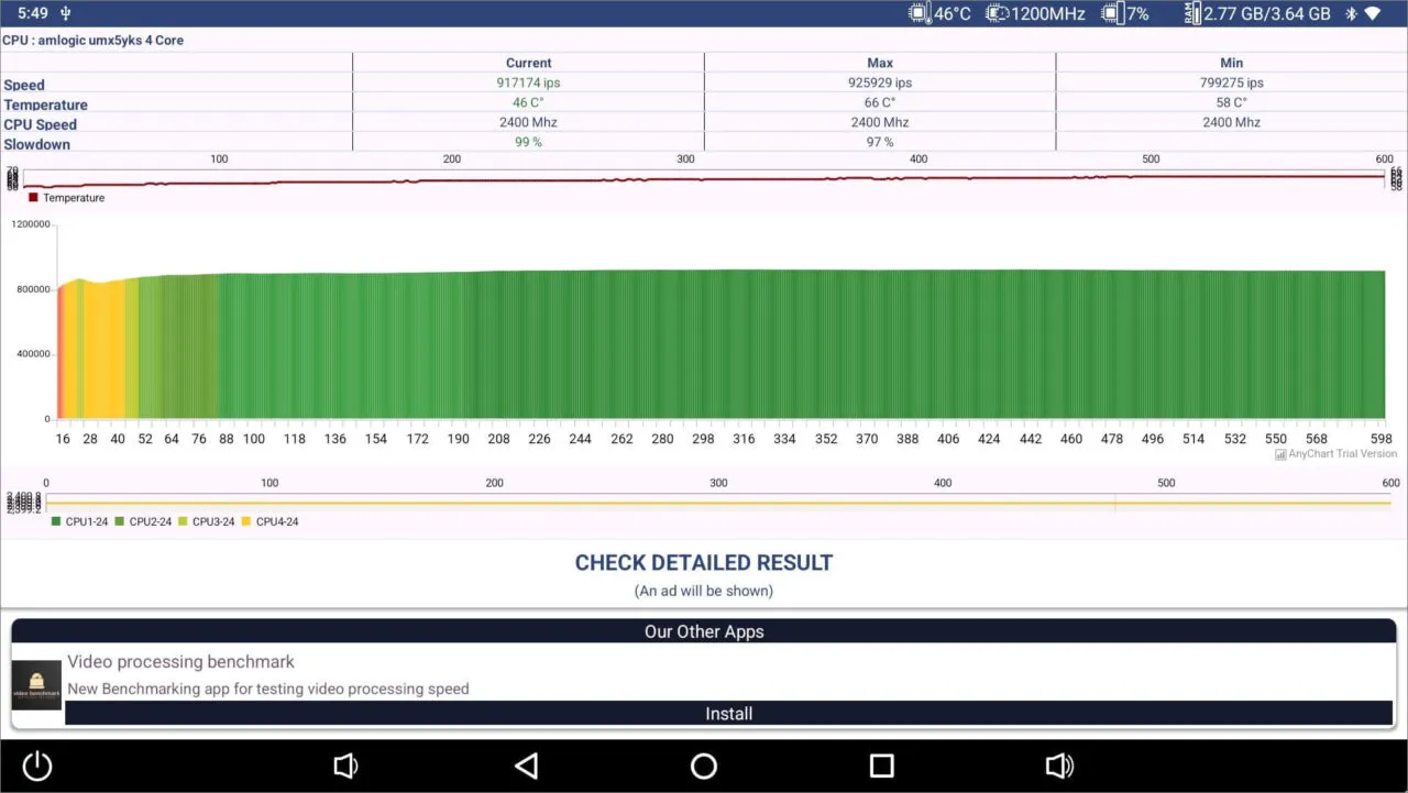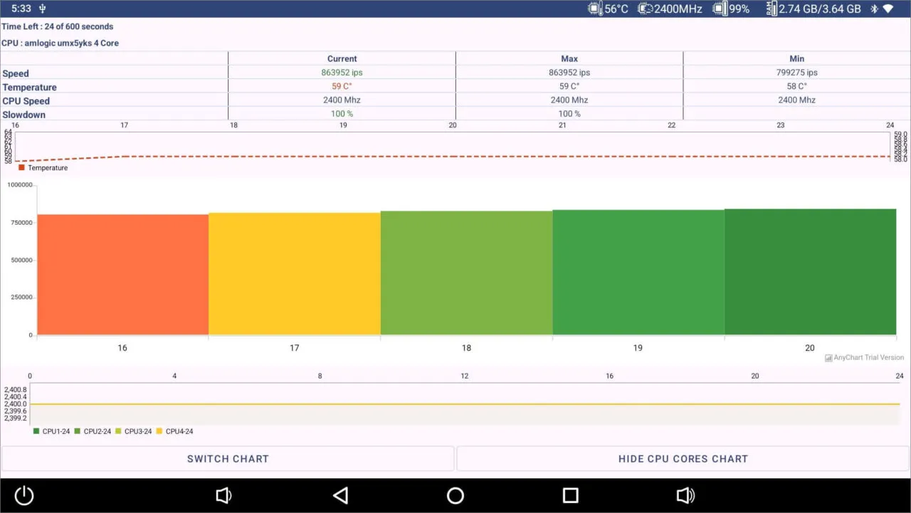 In this test, we maximized the CPU cores at 2,400 MHz for about 10 minutes in an ambient temperature of 27°C. We started with an initial temperature of approximately 46°C. The highest temperature achieved during the test was 59°C, significantly below the maximum limit of 66°C. Notably, the metal case stayed relatively cool, which is a highly favorable result.