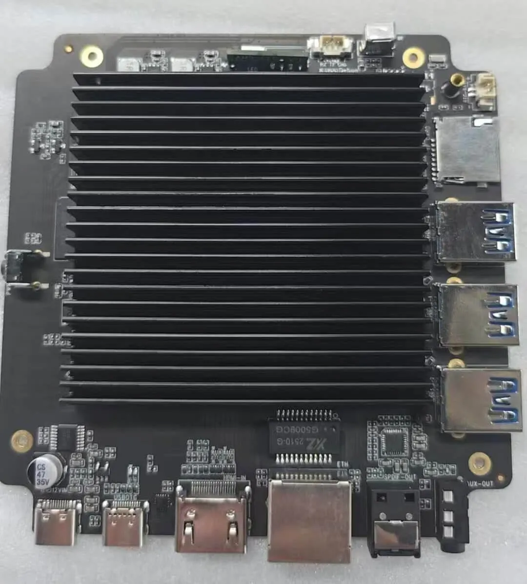 Ugoos has once again integrated a substantial passive heatsink into the chipset of the AM9 model, guaranteeing optimal temperatures and flawless performance, even during intense usage. Instead of taking the device apart, we contacted Ugoos for a photo of the PCB featuring the installed heatsink (see picture below). The image reveals that the majority of the electronic components are concealed beneath the heatsink unit.