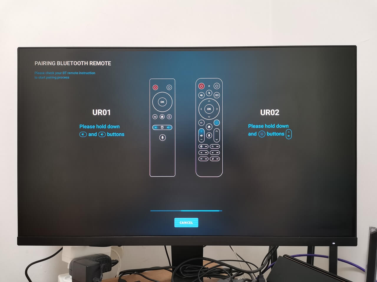 In the beginning setup process, the AM9 displays the pairing screen where you can select a Bluetooth remote control that Ugoos supports. You can choose the UR01, which boasts a sleek design with fewer buttons, or the UR02, a more advanced model that offers additional playback control buttons.