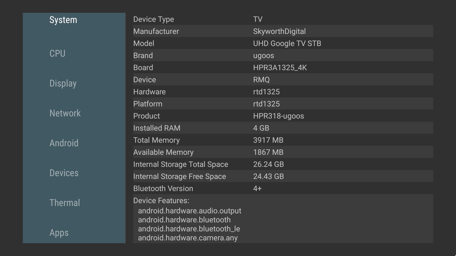 As previously mentioned, the SK2 device is categorized as a lower to mid-range device, powered by a Realtek RTD1325 quad-core ARM Cortex-A5 processor with a maximum clock speed of 800MHz up to 1.7 GHz, which is relatively modest. The CPU specifications suggest that it may not be the best option for managing resource-heavy Android gaming and graphics, due to the constraints of its processor.