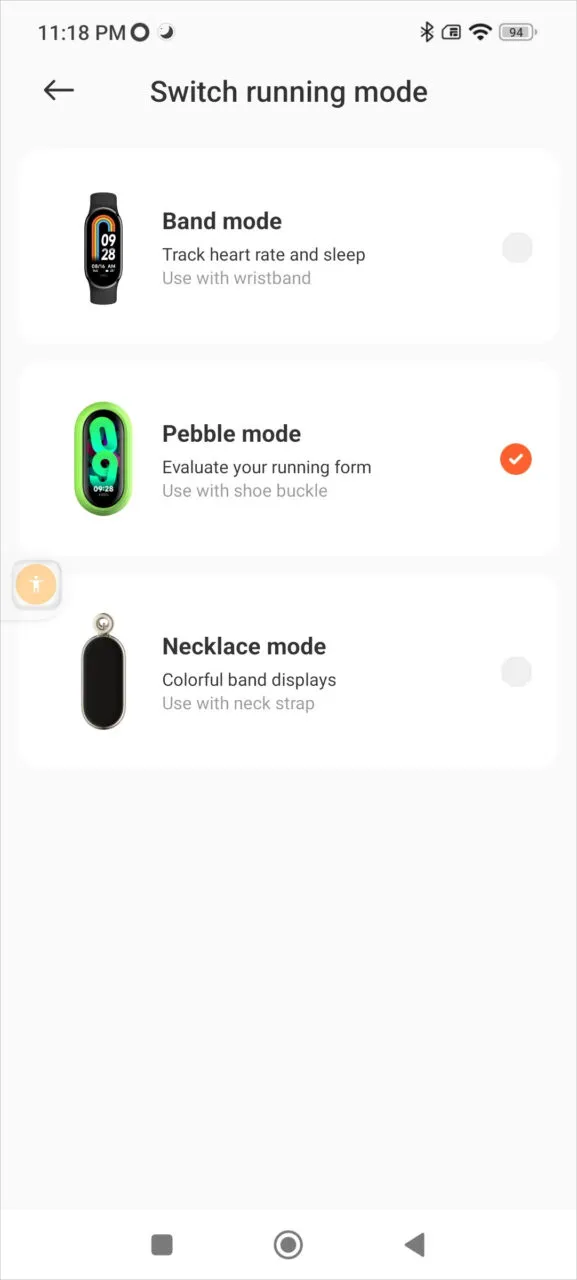 In order to simplify matters. Xiaomi has ingeniously integrated a gyro sensor into the tracker, providing comprehensive feedback on leg movements. The Xiaomi Mi Fitness app provides users with three unique running modes: Band mode, Pebble mode, and Necklace mode.